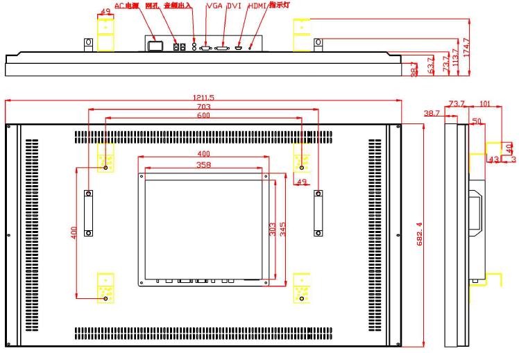 HDMI/DVI/VGA/AV/USB/RS232/ 电源接口